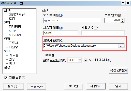 (5) 아래 화면과 같이 저장한 개인키를 WinSCP 접속정보에 입력해 줍니다