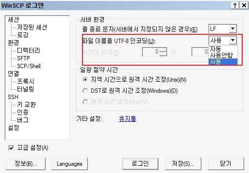 - UTF-8환경에서 한글이 깨어지는 경우에는, 로그인화면 > 환경 > 파일이름을 UTF-8 인코딩