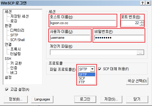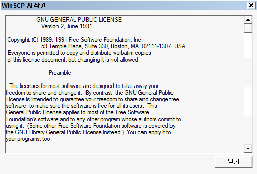 WinSCP는 영어뿐 아니라 한글을 포함한 다국어를 지원하는 GUI기반의 공개SW로서