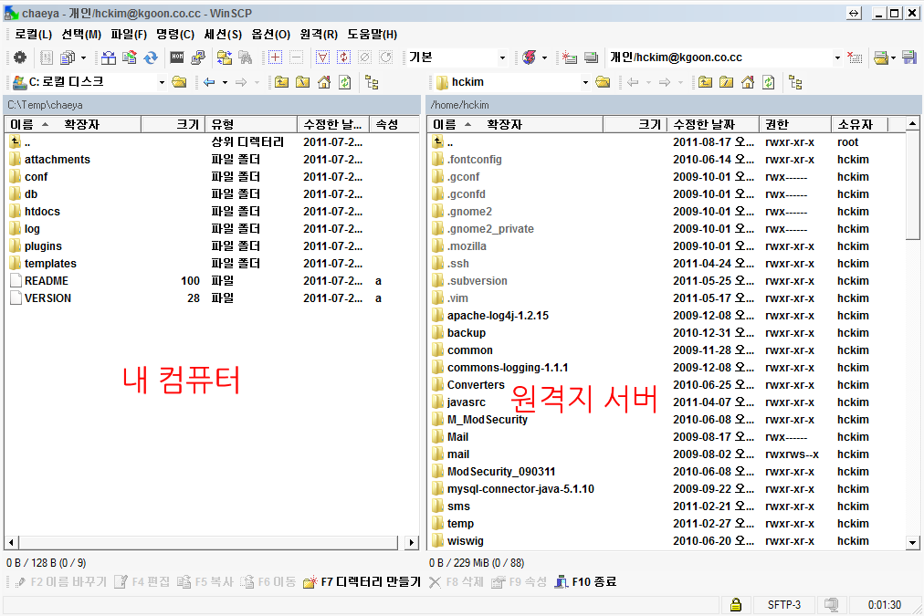 1) WinSCP를 이용해서 드래그 앤 드롭으로 원격 서버에 파일을 송수신 할 수 있습니다.