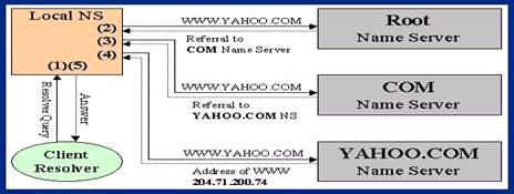 먼저 자신의 로컬 네임 서버에게 www.yahoo.com을 질의한다. 로컬 네임 서버는 자신의 캐쉬에 정보가 있는지 확인하고 없으면 루트 네임 서버에 질의를 한다. 루트 네임 서버는 자신이 질의에 대한 해답을 주지 못하므로 com도메인의 주소를 넘겨준다. 로컬 네임 서버는 다시 com 도메인 네임 서버에 질의를 하고 yahoo.com 의 주소를 받아서 다시 yahoo.com에 질의를 한다. 이 결과를 클라이언트에 넘겨주면 이 주소로 www.yahoo.com 을 찾아갈 수 있다.