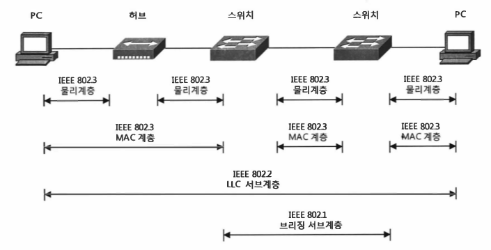 즉, 물리계층은 인접 장비간에 적용되는 프로토콜이다. LLC 서브계층은 스위치로 연결되는 종단장치간에 적용된다.