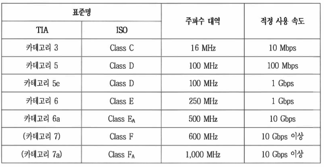 Class F, Class Fa에 해당하는 TIA 표준은 아직 정의되지 않았으나, 실무에서는 카테고리 7, 카테고리 7a라고 통용된다.