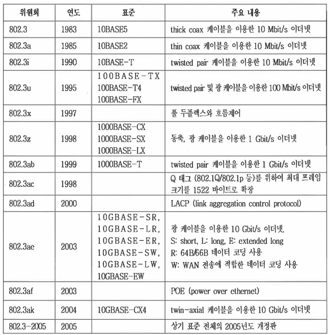 이더넷 물리계층은 신호 변환방식, 속도, LAN에서 사용되는 커넷터 및 케이블 종류 등을 정의한다. IEEE 802.3 물리계층은 다시 10BASE-T, 100BASE-TX, 1000BASE-LX, 10GBASE-LR, 100GBASE-ER4 등 전송속도 및 사용 케이블 종류에 따라 세분화 된다. 많이 사용되는 iEEE 802.3의 표준은 다음 표와 같다.