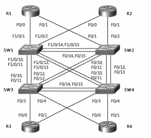 실습 네트워크의 구성에 대해서 간단히 살펴보자. 각 스위치들은 두 개의 인터페이스를 이용하여 연결되어 있다. 스위치 SW1의 F1/0/14, F1/0/15 포트는 스위치 SW2의 F0/14, F0/15 포트와 연결되어 있고, 스위치 SW1의 F1/0/10, F1/0/11 포트는 스위치 SW3의 F0/10, F0/11 포트와 연결되어 있으며, 스위치 SW1의 F1/0/12, F1/0/13 포트는 스위치 SW4의 F0/10, F0/11 포트와 연결되어 있다.