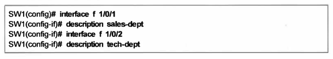 예를 들어, 인터페이스 FastEthernet 1/0/1은 영업부, FastEthernet 1/0/2는 기술부와 연결된다면 다음처럼 각 인터페이스에서 description 명령어를 사용하여 설명을 달 수 있다.