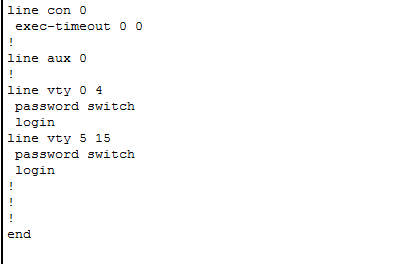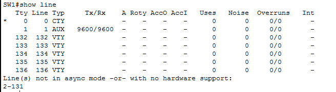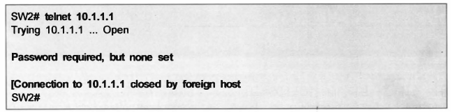 텔넷 패스워드는 스위치를 원격에서 텔넷 접속할 때 필요하다. 텔넷 패스워드를 설정하려면 다음과 같이 한다. 텔넷으로 동시 접속 가능한 수는 시스템마다 다르다. 이를 확인하려면 show line 명령어를 사용하면 된다.