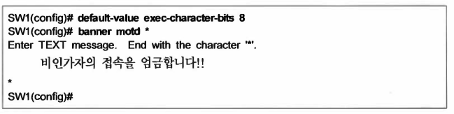 스위치에 접속 때 경고 메시지를 표시하려면 다음처럼 banner motd 명령어를 사용한다. 명령어 다음의 별포(*)는 메시지 입력이 끝났음을 표시하는 문자이며, 임의의 문자를 사용할 수 있다.