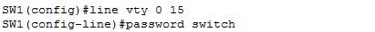 출력 결과에서 VTY라고 표시된 것들이 텔넷으로 접속할 수 있는 가상 포트 번호이다. VTY번호가 1에서 16까지이므로 텔넷으로 동시 접속 가능할 수는 16이다. 따라서, 텔넷 가상 포트에 모두 패스워드를 설정하려면 다음처럼 line vty 명령어 다음에 0에서 15까지의 번호를 지정하면 된다. 텔넷 패스워드를 설정하려면 password 명령어를 사용한다.