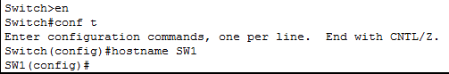 스위치의 이름을 부여하려면 전체 설정 모드에서 hostname 명령어를 사용한다. 기본적인 스위치 이름은 'Switch' 이다. 다음과 같이 이름을 'SW1' 로 지정하면 프롬프트가 변경된다.