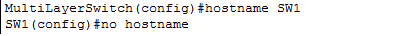 IOS는 설정를 취소하려면 명령어 앞에 no를 입력하면 된다. 예를 들어, 앞서 스위치 이름을 SW1으로 설정하기 위하여 hostname SW1이라고 했는데 다시 취소하려면 no hostname 이라고 하면 된다.