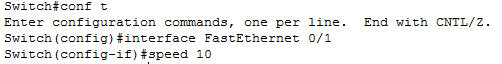 인터페이스 설정, 라우팅 설정, VLAN 설정 등 다양한 설정 모드는 전체 설정 모드에서 해당 명령어를 입력하면 들어갈 수 있다. 예를 들어, 인터페이스 F1/0/1의 속도를 10Mbps로 지정하려면 다음처럼 전체 설정 모드에서 인터페이스 설정 모드로 들어가야 한다.