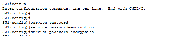 텔넷 패스워드도 암호화하려면 전체 설정 모드에서 service password-encryption 명령어를 사용하면 된다.