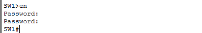 이 명령어를 사용하면 관리자용 패스워드가 암호화되어서 저장된다. 따라서, 패스워드를 잊으면 알 수 있는 방법이 없고, 패스워들 복구 절차에 따라 다른 것으로 변경해야만 한다. 이제 관리자 모드로 들어가기 위해서 사용자 모드에서 enable 명령어를 사용하면 다음처럼 패스워드를 요구한다.