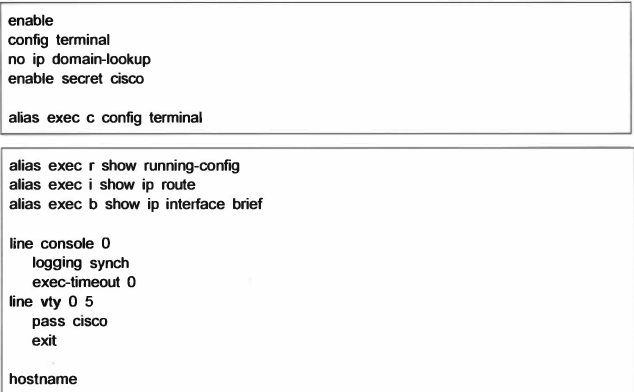 이제 각 장비의 부팅이 끝나면 모든 아루터와 스위치에 이 파일의 내용을 붙여넣고 마지막에 호스트 명을 지정하면 각 장비의 기본 설정이 끝난다. 그러나, 기본 설정의 내용이 익숙하지 않은 사람들은 기본 설정파일을 이용하지 말고 직접 명령어를 입력하는 연습을 하는 것이 좋다. 단축 명령어도 명령어가 익숙하지 않는 사람들은 사용하지 않는 것이 좋다.
