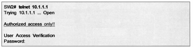 설정 후 스위치 SW1으로 텔넷 접속을 하면 다음처럼 경고 메시지가 표시된다.