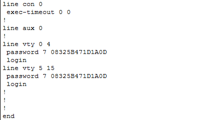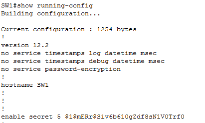 관리자용 패스워드는 다음과 같이 암호화되어 확인할 수 없지만 텔넷 패스워드는 show running-config 명령어를 사용하면 확인할 수 있다.