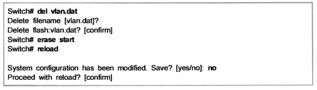 초기화 방법은 다음처럼 스위치의 VLAN 정보가 저장된 vlan.dat 파일을 delete vlan.dat 명령어를 사용하여 삭제한다. 또, erase start 명령어를 사용하여 설정 파일도 지운후 reload 명령어를 사용하여 재부팅한다. reload 명령어 사용시 설저 사항 저장여부를 묻는데 no라고 해야 한다.