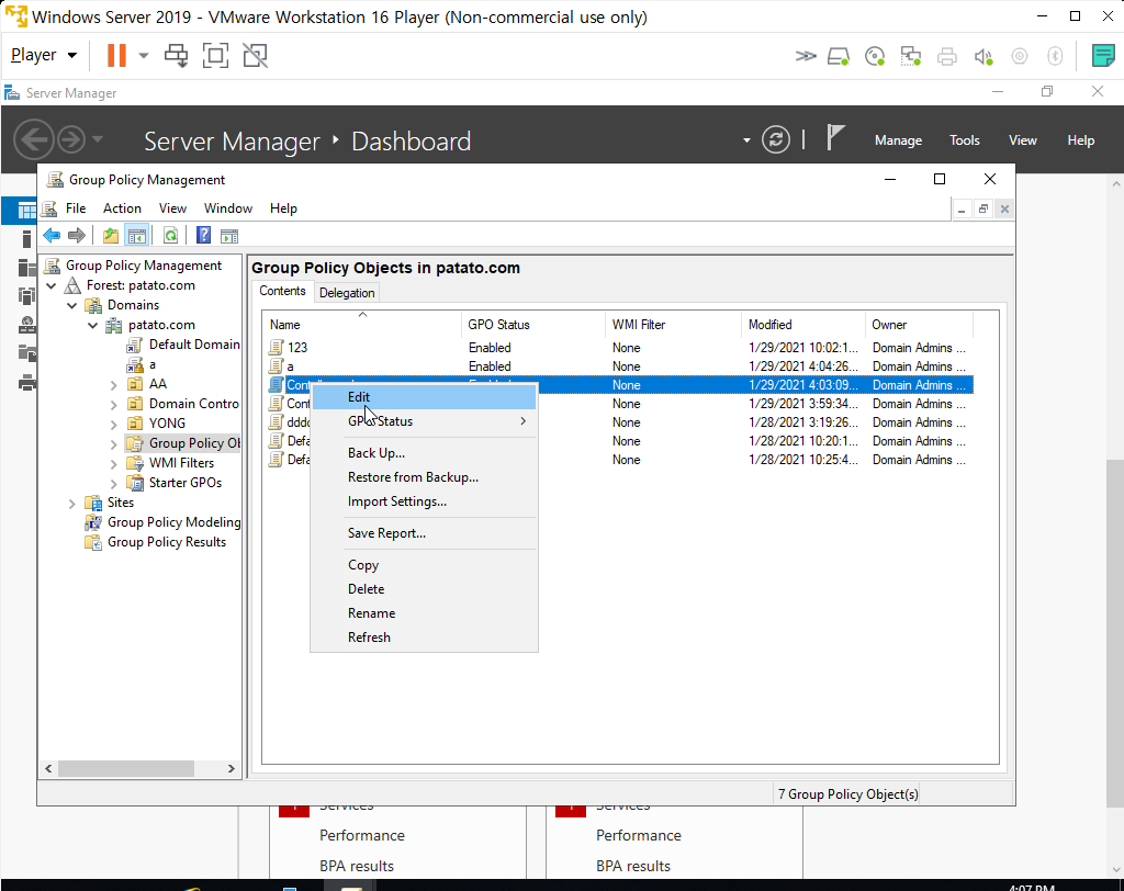 6. 만들어진 GPO를 마우스로 오른쪽 클릭 > Edit 를 눌러주자