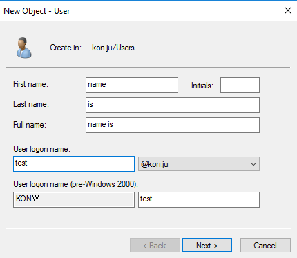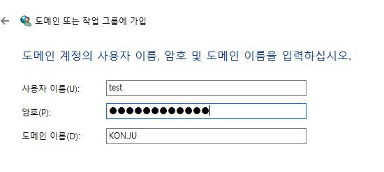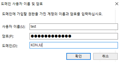 아까 ad서버에서 생성한 test 계정 정보를 입력해준다.