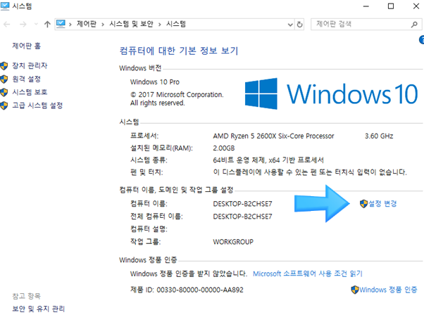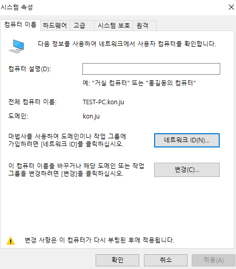 시스템에서 컴퓨터 이름 옆에 있는 설정 변경을 눌러준다.