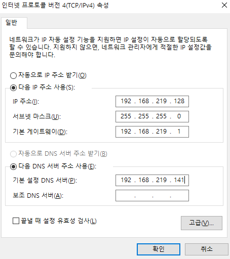 DNS서버를 AD서버의 아이피로 잡아준다.