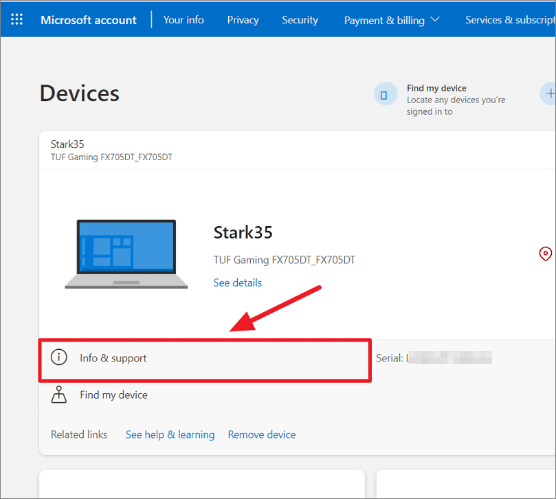 그러면 Microsoft 계정에 연결된 장치를 추적하고 관리할 수 있는 Microsoft 계정의 ‘장치’ 페이지가 열립니다. Microsoft 계정의 장치 페이지에서 장치 이름 아래의 ‘정보 및 지원’ 옵션을 클릭합니다.