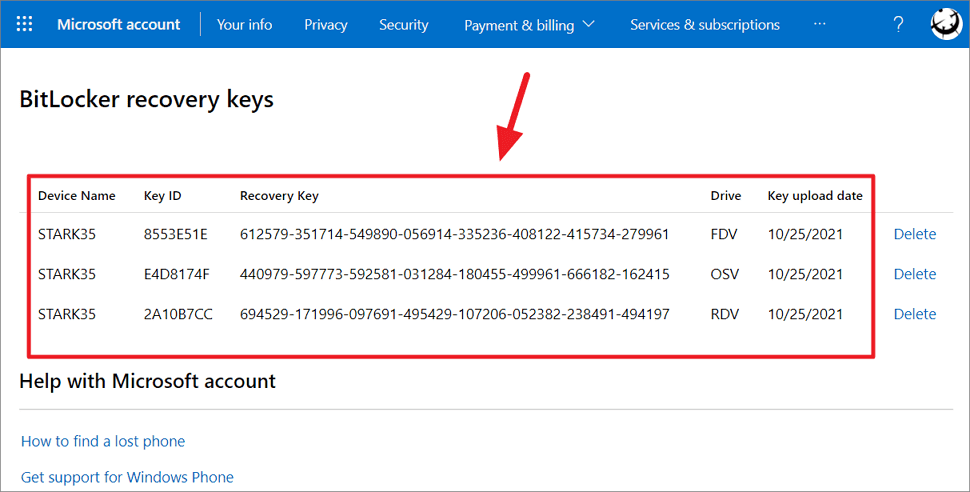 BitLocker 설정 프로세스 중에 Microsoft 계정에 복구 키를 저장/백업하도록 선택한 경우 Microsoft 계정에서 쉽게 검색할 수 있습니다.