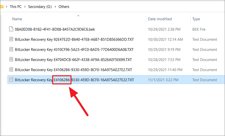 알고 있는 특정 위치에 하나에서 두 개의 복구 키만 저장했다면 더 쉽게 검색할 수 있습니다. 그러나 여러 개의 암호화된 드라이브에 대해 여러 개의 복구 키를 저장한 경우 올바른 복구 키를 찾기가 어려울 수 있습니다. 이것이 Windows가 키 ID를 제공하여 복구 키를 찾는 데 도움이 되는 이유입니다. 키 ID와 일치하는 파일 이름으로 복구 키 파일(‘.TXT’ 또는 ‘.BEK’)을 검색할 수 있습니다.