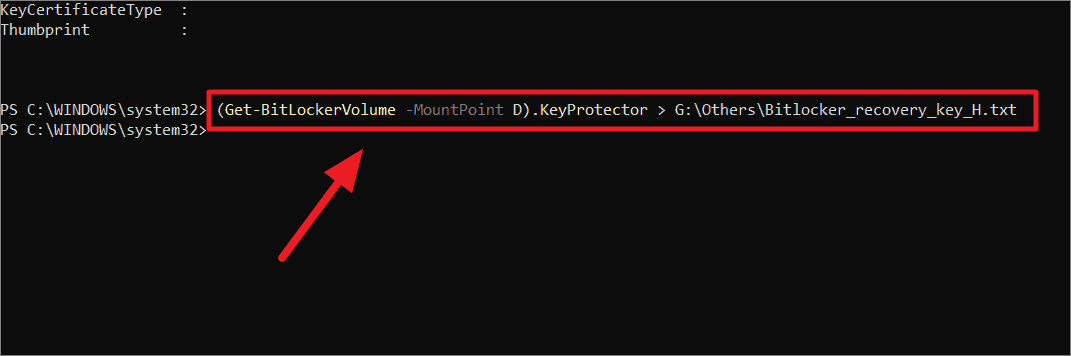 (Get-BitLockerVolume -MountPoint D).KeyProtector > G:OthersBitlocker_recovery_key_H.txtCopy