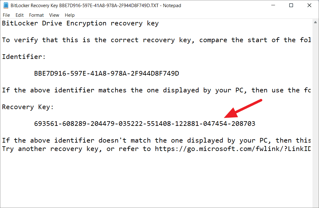 복구 키 파일을 찾으면 엽니다. 그리고 키 ID(식별자) 줄과 복구 키를 찾을 수 있습니다.