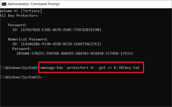 manage-bde -protectors H: -get >> K:RCkey.txtCopy