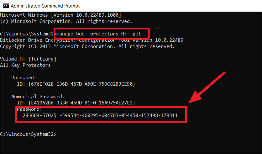 위의 명령에서 드라이브 문자 ‘H’를 복구 키를 찾으려는 드라이브로 바꿔야 합니다. 위의 명령을 입력하면 암호 섹션 아래에 복구 키가 표시됩니다. 아래와 같이 48자리 긴 숫자의 문자열입니다.