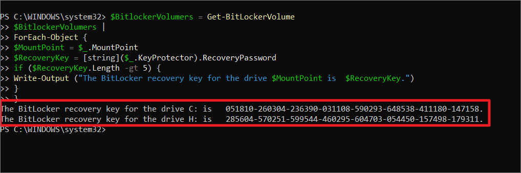Get-BitLockerVolume | ? {$_.KeyProtector.KeyProtectorType -eq RecoveryPassword} | Select-Object MountPoint,@{Label=’Key’;Expression={$($_.KeyProtector.RecoveryPassword)}}Copy