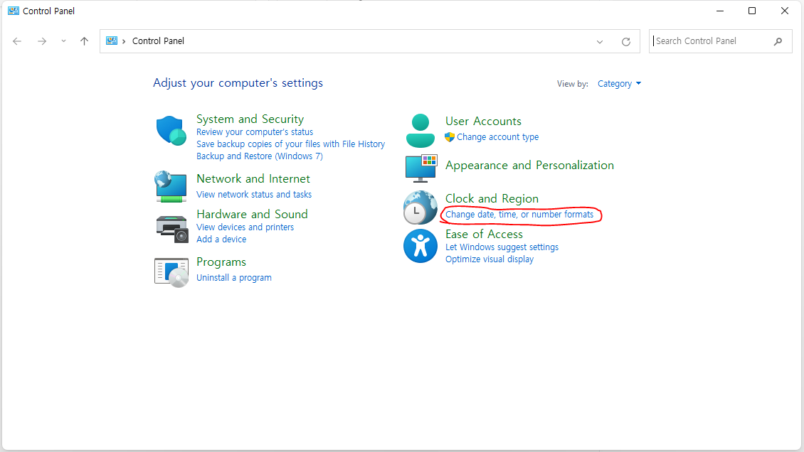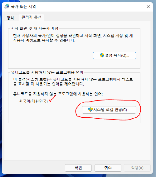 위 사진에서 여러분들과의 차이점은 유니코드를 지원하지 않는 프로그램에 사용하는 언어 부분이 영어로 되어있을겁니다.