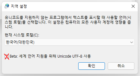 단, Beta 기능인 유니코드 사용은 하시면 안됩니다.