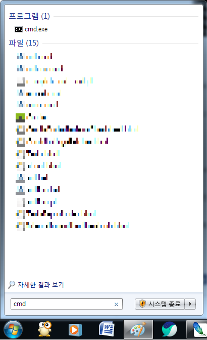 윈도우 좌측 하단의 시작버튼을 클릭하고 '프로그램 및 파일 검색' 입력창에 cmd 라고 입력합니다.