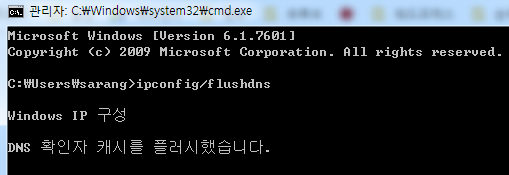 그러면 위와 같이 'DNS 확인자 캐시를 플러시했습니다.'라는 메시지가 표시됩니다.