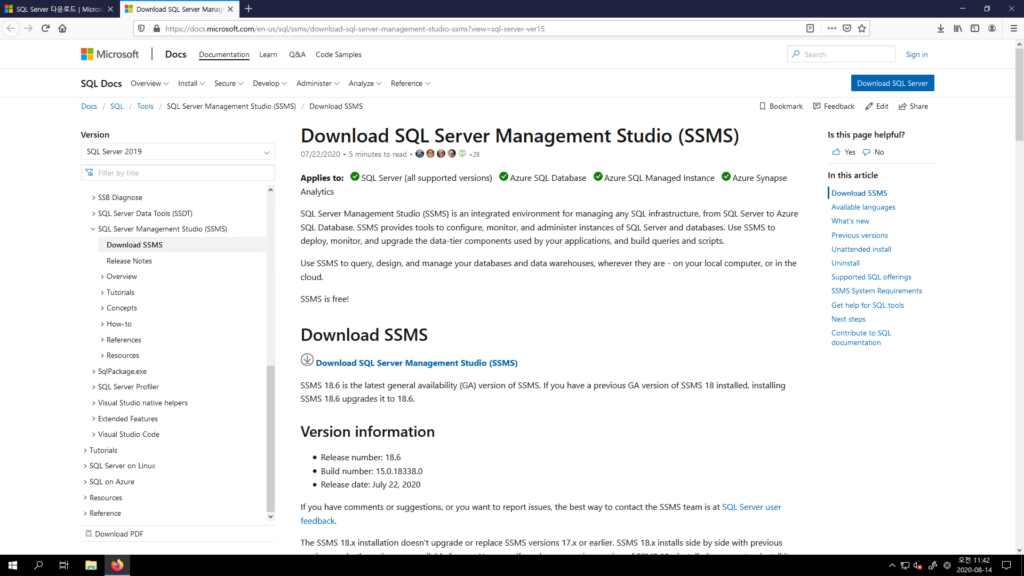 - SSMS 다운로드 페이지 : https://docs.microsoft.com/ko-kr/sql/ssms/download-sql-server-management-studio-ssms?view=sql-server-ver15