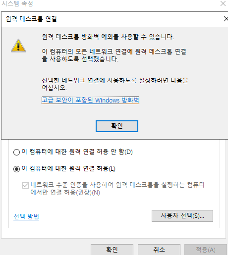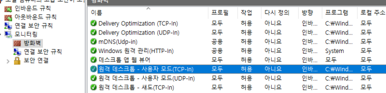 원격 연결을 허용하면 방화벽 쪽에 원격 데스크톱 관련 항목이 생긴다는 내용입니다.