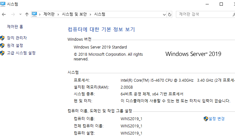 제어판 -> 시스템 및 보안 -> 시스템으로 진입합니다.