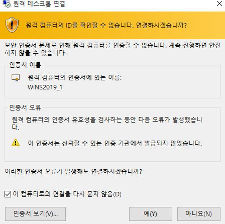 현재는 사용하는 인증서가 없기 때문에 원격 컴퓨터의 ID를 확인할 수 없다고 안내합니다.