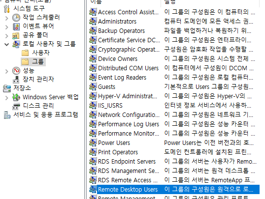 로컬 사용자 및 그룹 -> 그룹 -> Remote Desktop Users를 확인할 수 있습니다.