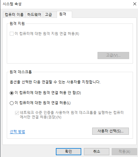 원격 데스크톱 항목 쪽의 이 컴퓨터에 대한 원격 연결 허용(L)에 체크합니다.