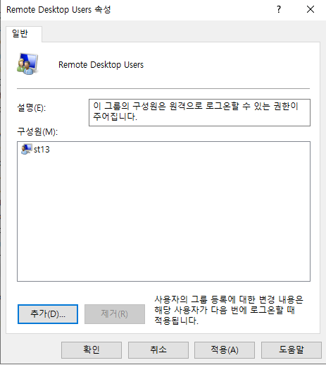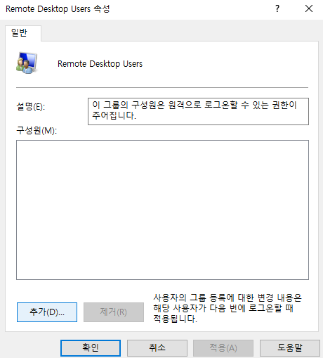 추가한 계정이 Remote Desktop Users의 구성원으로 들어간 것을 확인 후 확인을 누릅니다.