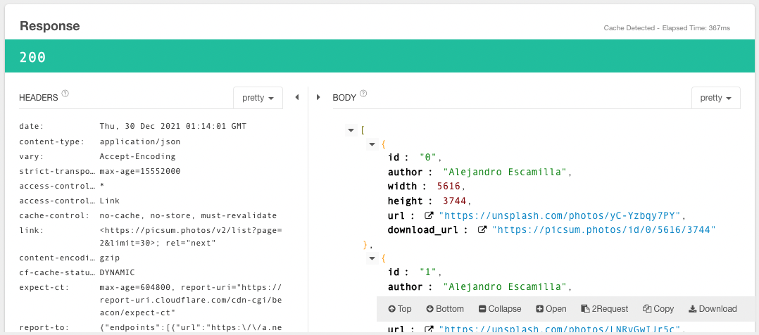 응답코드 200과 수신받은 JSON 데이터를 확인이 됩니다.