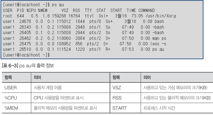 ·a 옵션과 u 옵션을 함께 사용하면 터미널에서 실행한 프로세스의 상세 정보를 출력: CPU와 메모리 사용량 등