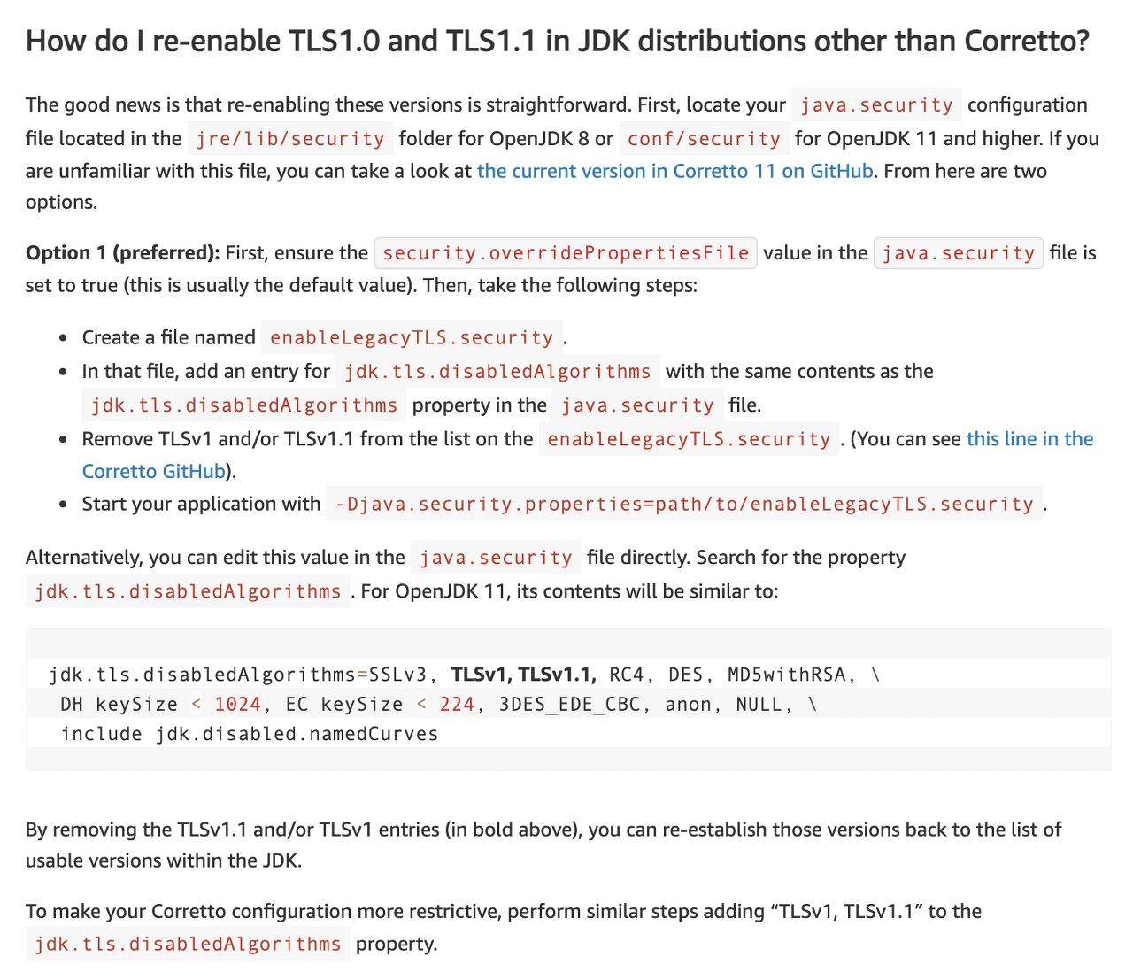 | OpenJDK will be disabling TLS 1.0 and 1.1 availability by default in the security.properties file. Java applications using TLS to communicate will need to use TLS 1.2 or above to establish a connection. The change will apply to at least OpenJDK 8u292 onward, OpenJDK 11.0.11 onward, and all versions of OpenJDK 16, following the JRE and JDK Crypto Roadmap published by Oracle. |