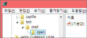 - 이제 실행될 동작에 해당하는 이름을 가진 [Key]를 하위에 추가하면 된다. 여기서는 프로그램을 실행하는 [open]이라는 [Key]를 [shell] 하위에 추가하도록 하겠다.