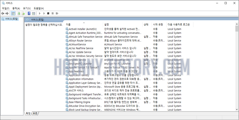 윈도우 서비스에 등록된 프로그램의 상태를 확인하거나 서비스 시작 유형(자동, 수동, 사용안함) 등을 설정할 수 있다.